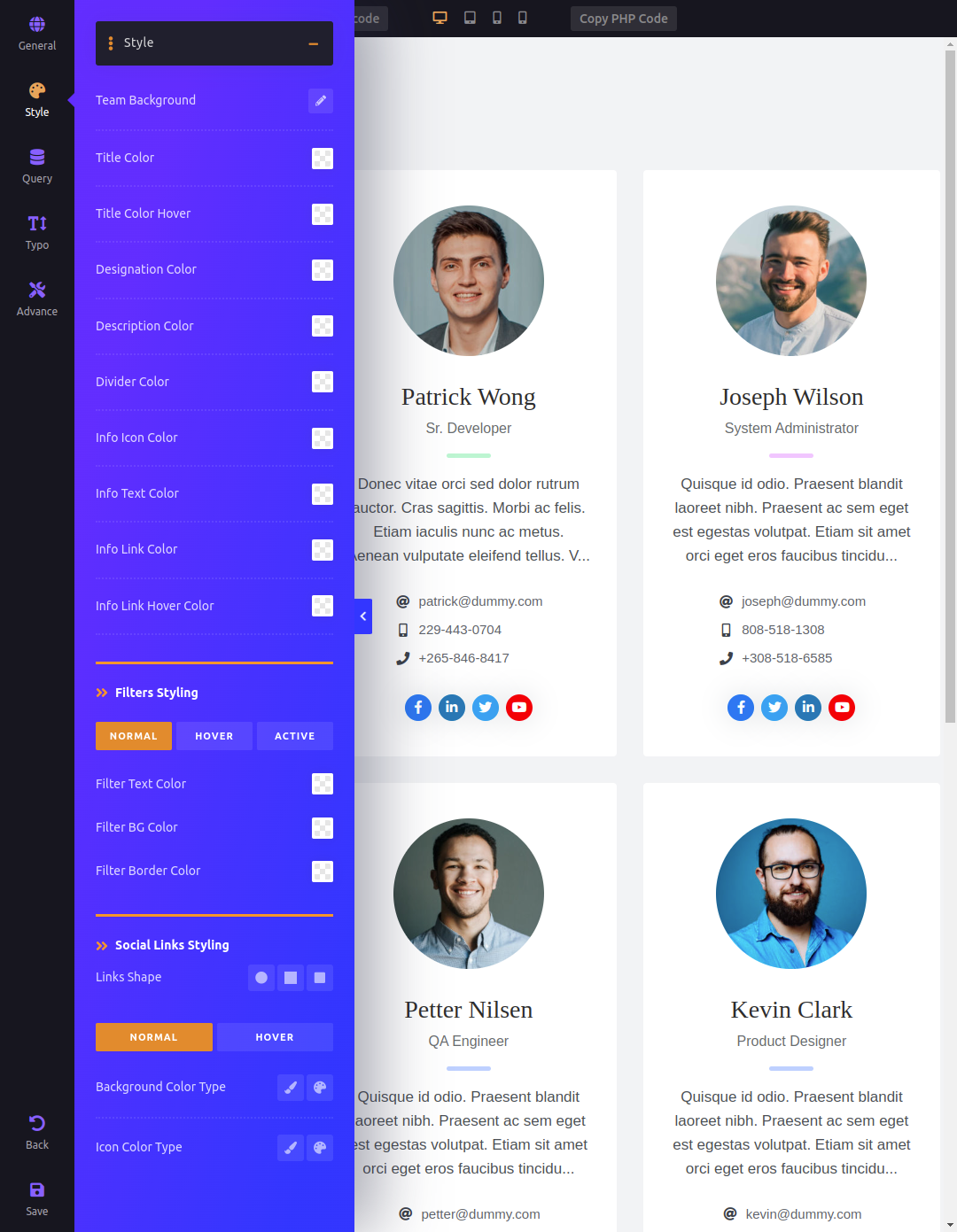 In the Style tab, many fields are available like Title color, Designation color, Description color, Filters colors, etc. These fields are helpful to customize the looks of the team members to match the rest parts of the Website.