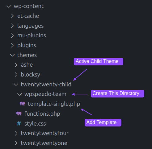 - Make a directory named wpspeedo-team inside your active theme. (It is better to create the directory inside your active child theme).